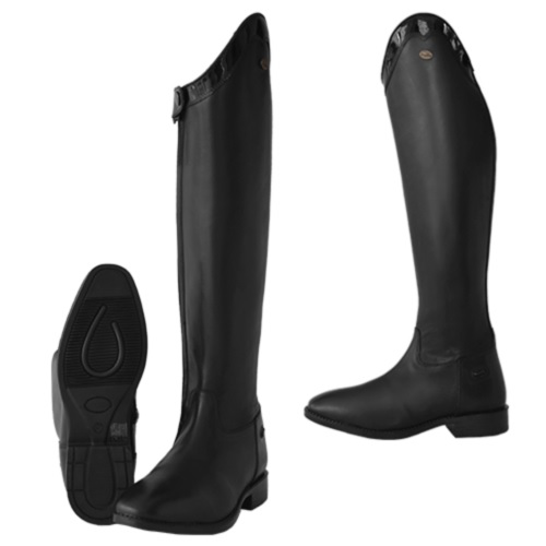 Bota de montar inglesa para doma clásica confeccionada con cuero de alta calidad muy suave pero firme que le confiere un alto rendimiento y confort. Forro interior de cuero y cremallera en la parte delantera interior con cierre de seguridad. Elegante ribete superior de cuero charol. Bota con forma muy anatómica que confiere una gran sujeción en la zona del tobillo y puntera de estilo actual. También posee soportes laterales en la zona del talón para una mejor colocación de las correas de espuela.