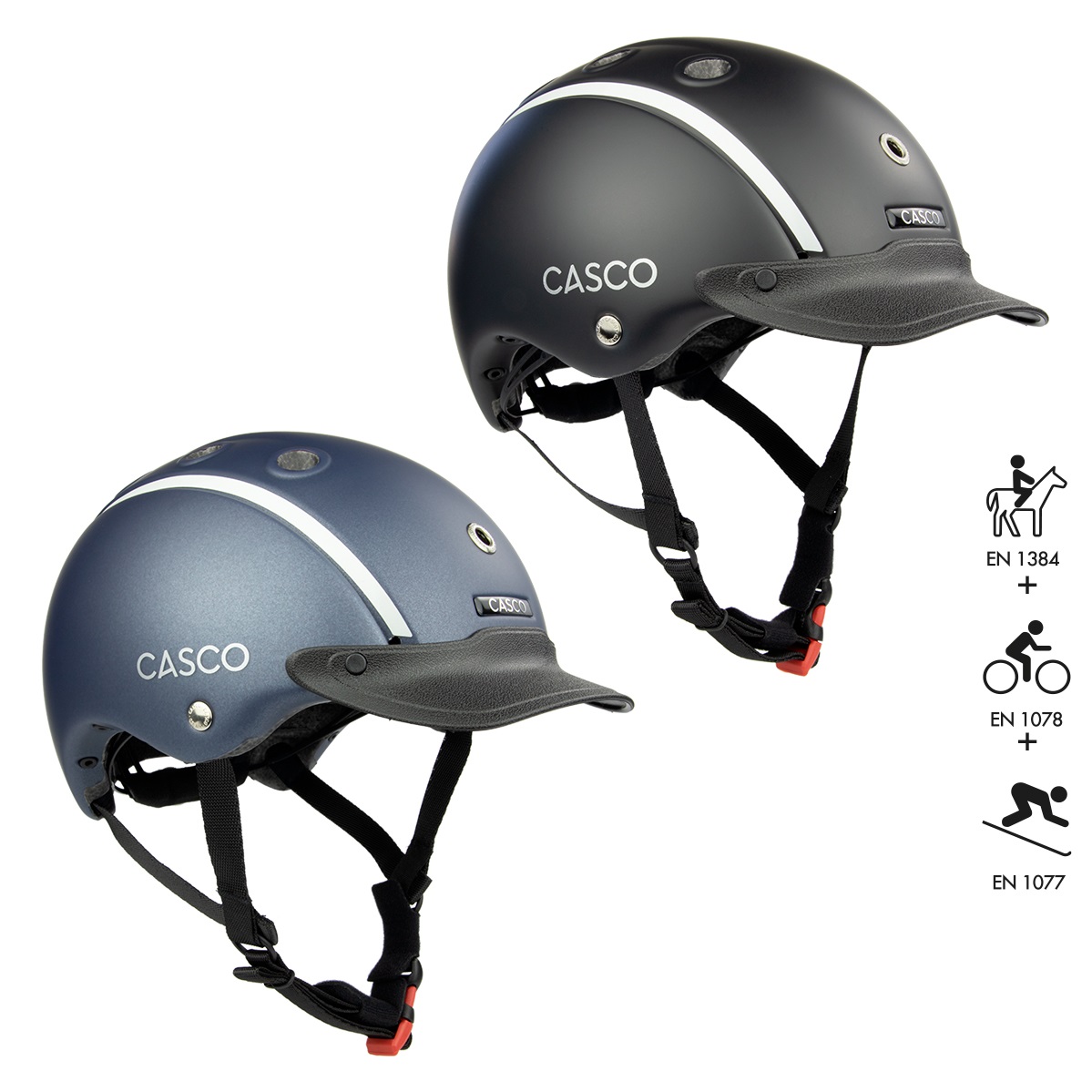 Homologado bajo la nueva normativa EN 1384 de equitacion, EN 1078 de ciclismo y EN 1077 de esqui