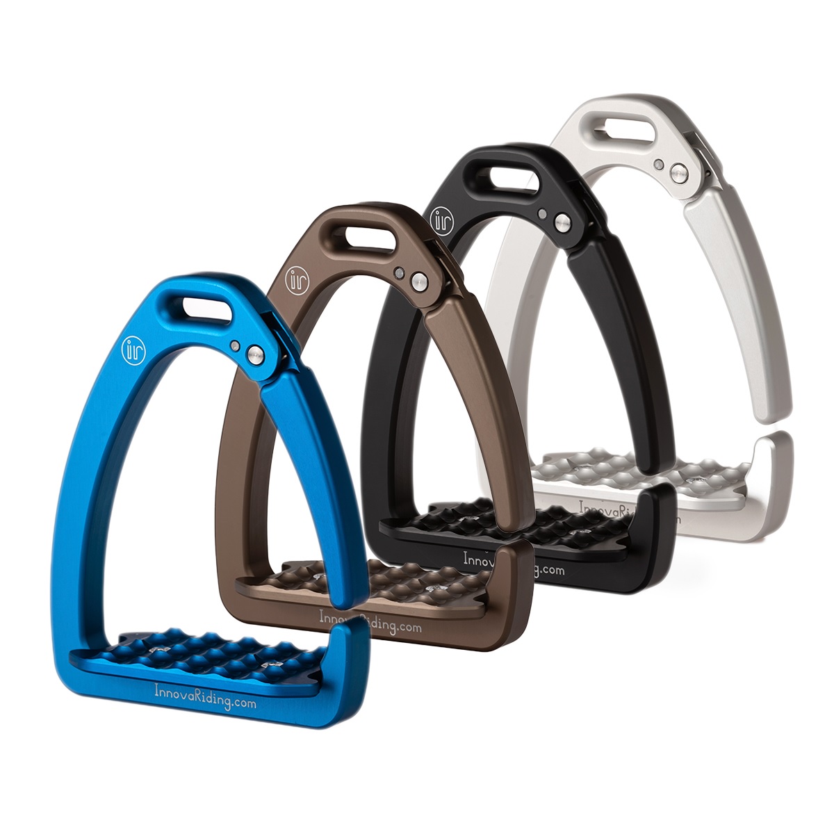 Los estribos de equitación Innova están especialmente creados para que te sientas seguro mientras montas. En caso de necesidad, la parte móvil se abre permitiendo que el pie se libere de los estribos, y luego vuelve automáticamente a su posición cerrada.