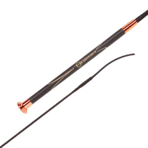 Fusta con tralla, el cuerpo forrado de nylon, empuñadura realizada en poliuretano con mucho agarre y tope metálico.