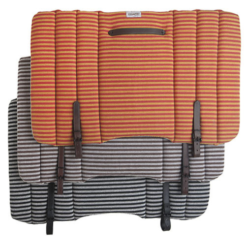 Acolchada y realizada con la tradicional lona utilizada en la doma vaquera. Asa y correas de fijación realizadas en cuero.
