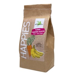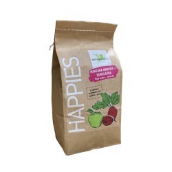 Pradera: cáscara de hierba seca de las estribaciones alpinas, mezcla de verduras (zanahorias, apio, remolacha), pulpa de remolacha, bayas silvestres (arándano, frambuesa, rosa mosqueta), pulpa de manzana, hierbas (cardo mariano, ortiga, cúrcuma), jarabe de palatinosa isomaltulosa, harina de algas marinas, aceite de girasol prensado en frío, condimento de malta y levadura, canela, miel.