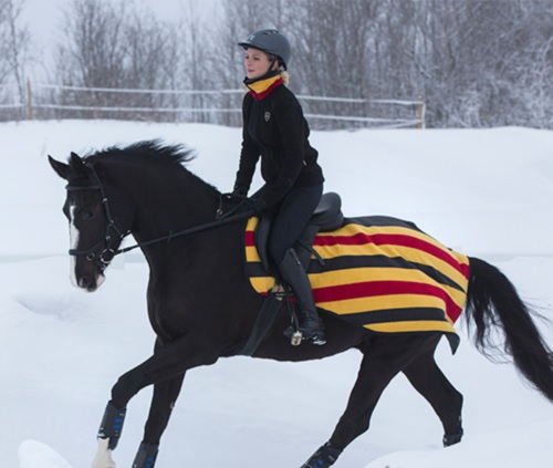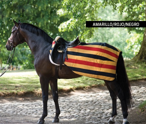 Manta de competición con corte y hueco alrededor de la silla y velcro en la parte delantera para una correcta fijación.