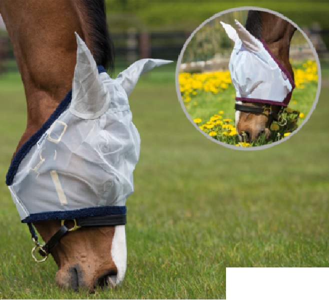 Material de malla muy ligero y elástico para proteger la cara del caballo de los insectos con forma anatómica y amplias y suaves orejeras.