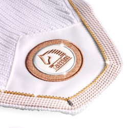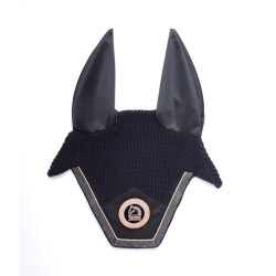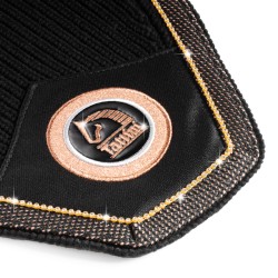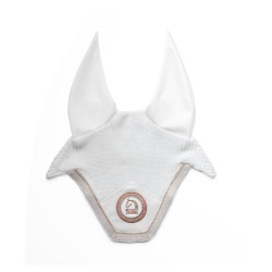 En punto inglés de algodón crochet, de forma cuadrada, con cubreorejeras elásticas, rematado con cordoncillo brillante en oro rosa, con hilo de strass en contraste y elegante insignia Tattini personalizada.