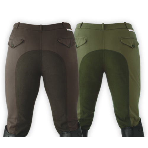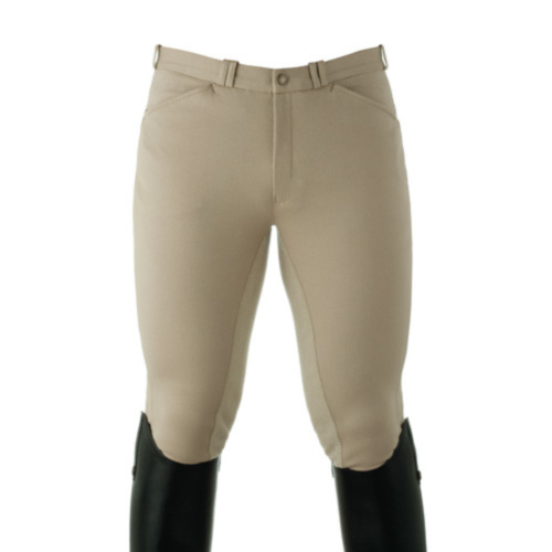 Pantalón hombre ajustado con culera de piel sintética. Incluye dos bolsillos frontales laterales exteriores inclinados y dos bolsillos traseros con solapa y botón.