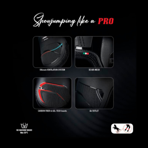 El protector CARBON PRO Menudillo representa la evolución de nuestros protectores para caballos de salto más conocidos y más vendidos, ahora rediseñados con un diseño profundamente revisado para ofrecer al caballo protectores aún más ligeros y transpirables y un área de protección más completa.